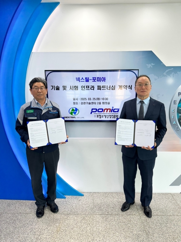 강관 제조 전문기업 넥스틸(부사장 김이용)은 지난 25일 포항블루밸리국가산업단지 내 포항소재산업진흥원 강관기술센터(POMAI PiTEC)에서 포항소재산업진흥원 (원장 김헌덕)과 기술 및 시험 인프라 파트너십’ 계약을 체결했다.