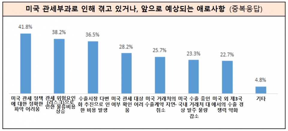 이번 조사에서 기업들은 가장 큰 애로사항으로 ‘미국 관세정책에 대한 정확한 파악 어려움’(41.8%/중복응답)을 꼽았다. 그 뒤를 ▲관세 위험요인(리스크)으로 인한 물류비용 상승 (38.2%), ▲수출국 다변화 비용 발생(36.5%), ▲미국 관세 대상 여부 확인 어려움(28.2%) ▲미국 거래처의 수출계약 지연·취소로 인한 경영애로(25.7%), ▲미국 수출 중인 국내 거래처 대상 발주 물량 감소(23.3%), ▲미국 외 제3국에서의 수출 경쟁력 악화(22.7%) 순으로 응답했다. 응답 1위와 3위가 관세 정보가 부족하다는 의미를 담고 있어 관련 업계에 정확하고 신속한 정보 제공이 필요한 것으로 확인됐다.