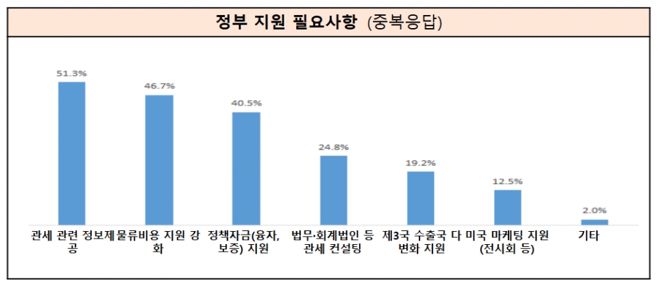 아울러 업계에선 정부 지원 요청 사안으로 ▲관세 관련 정보제공(51.3%), ▲물류비용 지원 강화(46.7%), ▲정책자금(융자/보증) 지원(40.5%), ▲법무·회계법인 등 관세 전문상담(컨설팅)(24.8%), ▲‘제3국 수출국 다변화 지원(19.2%), ▲미국 홍보(마케팅) 지원(전시회 등) (12.5%) 순으로 응답했다. 가장 큰 애로 사항인 관세 부과 정보를 정부가 해소해달라고 요청하면서 수출 부문의 지원도 필요하다고 응답한 것이다.