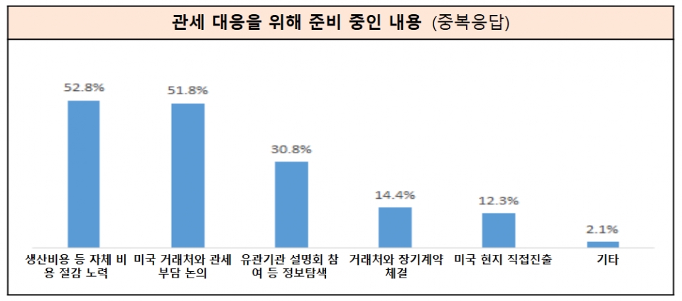 또한, 응답 기업 중 32.5%만이 미국 관세 대응을 준비하고 있는 것으로 나타났다. 이들이 대응안으로 준비하는 내용은 ▲생산비용 등 자체비용 절감 노력(52.8%), ▲미국 거래처와 관세 부담 논의(51.8%), ▲유관기관 설명회 참여 등 정보탐색(30.8%), ▲거래처와 장기계약 체(14.4%), ▲미국 현지 직접 진출 (12.3%) 순으로 나타났다.