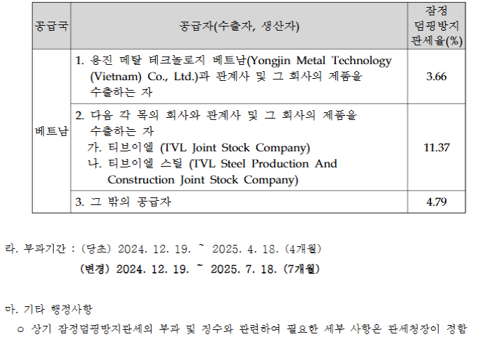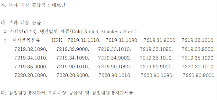 지난해 12월, 기획재정부는 2024년 12월 19일부터 올해 4월 18일까지 베트남 STS CR 공급자에 3.66~11.37% 수준의 반덤핑 잠정 관세를 부과한다고 밝힌 바 있다. 구체적으론 베트남 메탈 테크놀로지 베트남에 3.66%가, 티브이엘(TVL)과 티브이엘 스틸에 11.37%가, 그밖에 베트남 공급자에 4.79%가 부과됐다.