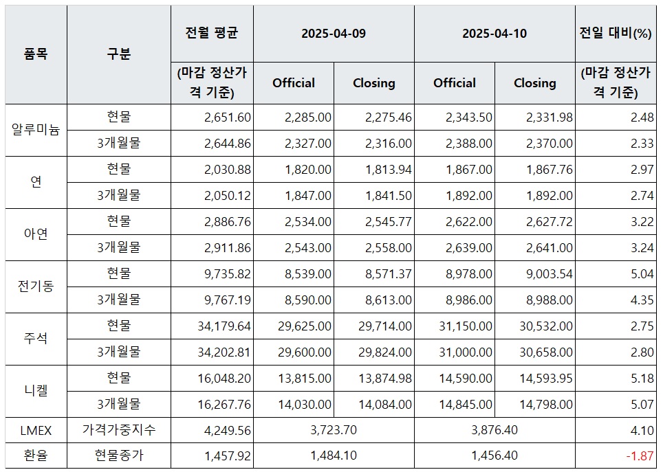 [표] LME 비철금속 및 환율 동향(4월10일)