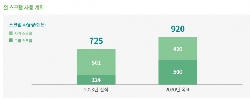 실제 포스코는 철스크랩 사용량을 2023년 725만 톤에서 오는 2030년 920만 톤으로 25% 이상 증대를 목표로 하고 있다.