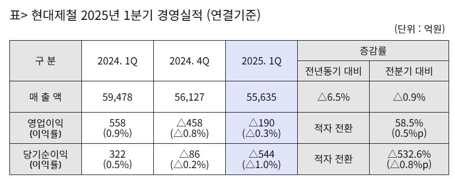현대제철은 24일 올해 1분기 연결기준 매출액 5조5,635억원, 영업손실 190억원, 당기순손실 544억원을 기록했다고 밝혔다. 1분기 매출은 전분기 대비 0.9% 감소했으며, 지난해 4분기부터 2개 분기 연속 영업손실과 순손실을 이어갔다.
