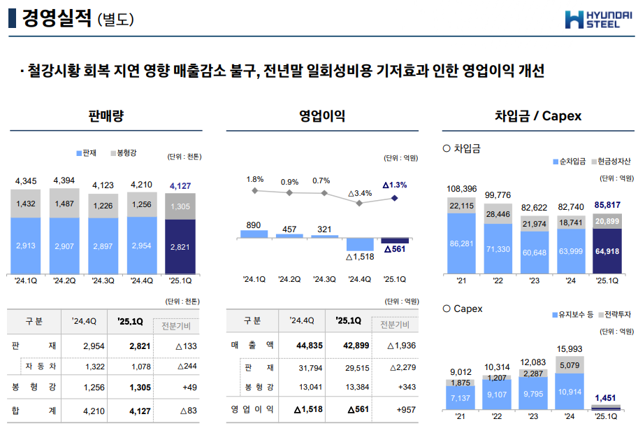 현대제철은 "철강시황 회복 지연 및 파업의 영향으로 1분기 매출액이 전분기 대비 소폭 감소했으나, 전분기 말 일회성 비용 등에 따른 기저효과로 영업이익은 268억원 개선됐다"고 설명했다.