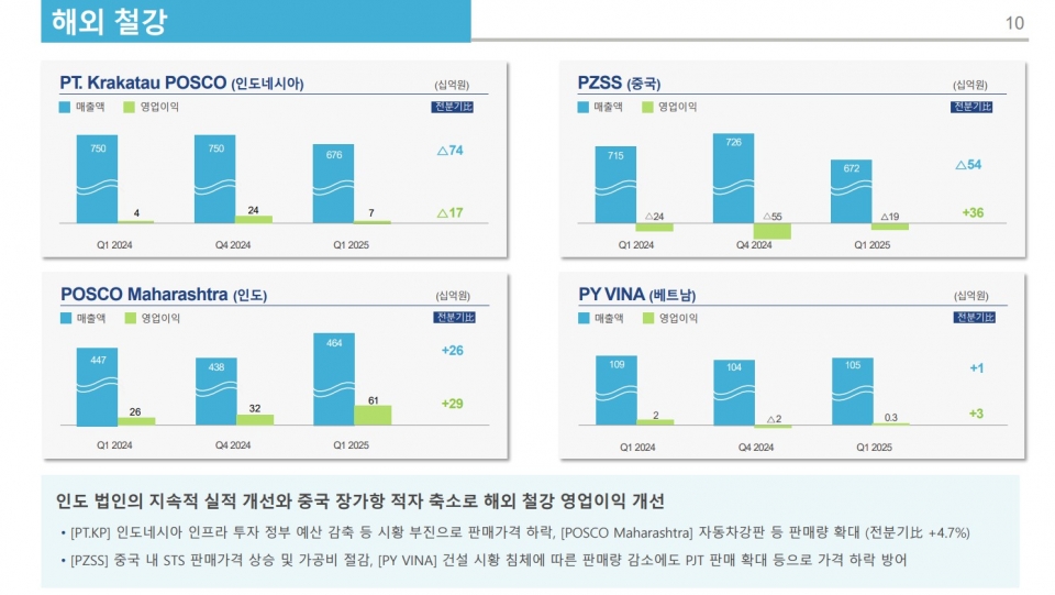 회사측에 따르면 인도네시아 인프라 투자 정부 예산 감축 등 시황 부진으로 판매 가격 하락으로 이어졌지만 자동차강판 등 판매량을 늘렸다. 이어 중국 해외 법인의 경우 현지 스테인리스(STS) 판매가격 상승 및 가공비를 절감했고 베트남 법인의 경우 건설 시황 침체에 따른 판매량 감소에도 PJT 판매 확대 등으로 가격 하락을 방어했다.