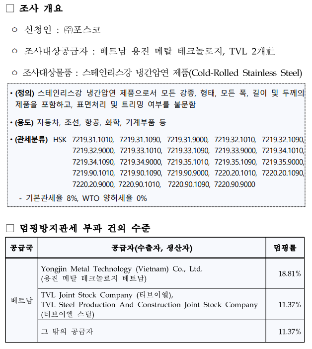 24일, 산업통상자원부 무역위원회는 제459차 회의를 열고 베트남산 STS CR 최종 관세 부과 건을 심의·의결했다. 무역위원회는 “조사 결과, 덤핑사실과 덤핑수입으로 인해 국내산업에 실질적 피해가 있다고 최종 판정했다”며 향후 5년 간 최대 18.81% 덤핑방지관세 부과를 관세법안을 최종 제정하는 기획재정부장관에게 건의하겠다고 밝혔다.