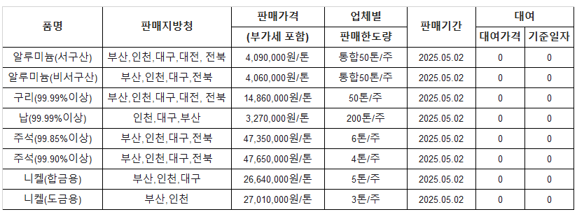 [표] 조달청 방출 가격(5월 2일)