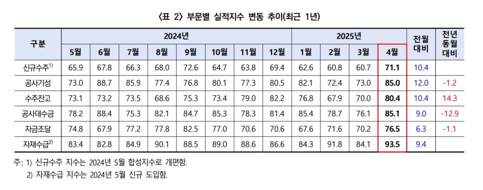 4월 모든 세부 지수가 전월 대비 상승한 가운데 특히 공사기성지수(85.0, +12.0p)가 가장 큰 오름폭을 보였다. 이어 신규수주(71.1, +10.4p)와 수주잔고(80.4, +10.4p)에서도 두 자릿수 상승폭을 나타냈으며, 이 밖에 자재수급(93.5, +9.4p), 공사대수금(85.1, +9.0p), 자금조달(76.5, +6.3p) 지수도 모두 상승했다.