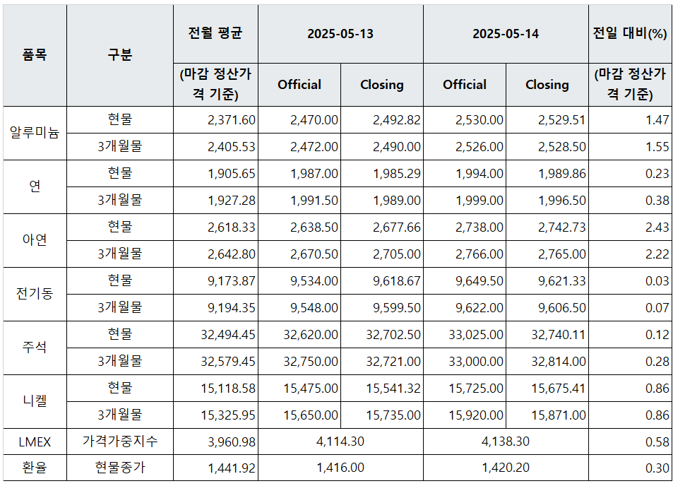 [표] LME 비철금속 및 환율 동향(5월 14일)