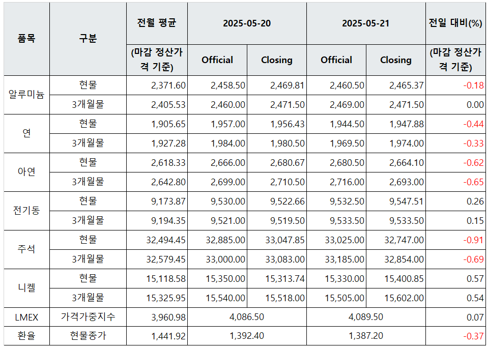 [표] LME 비철금속 및 환율 동향(5월 21일)