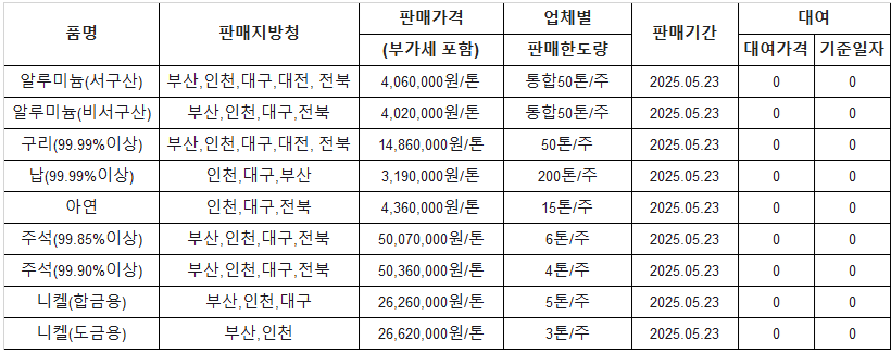 [표] 조달청 방출 가격(5월 23일)