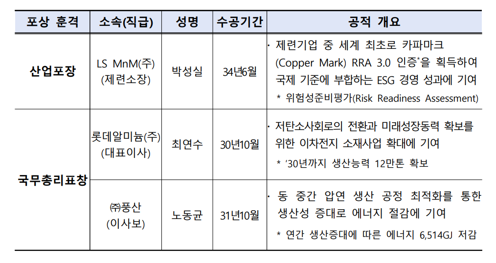 LSMnM의 박성실 소장은 제련기업 중 세계 최초로 구리 위험성준비평가(Copper Mark RRA 3.0) 인증을 획득하여 국제 기준에 부합하는 ESG 경영 성과에 기여한 공로로 산업포장을 수상했다.