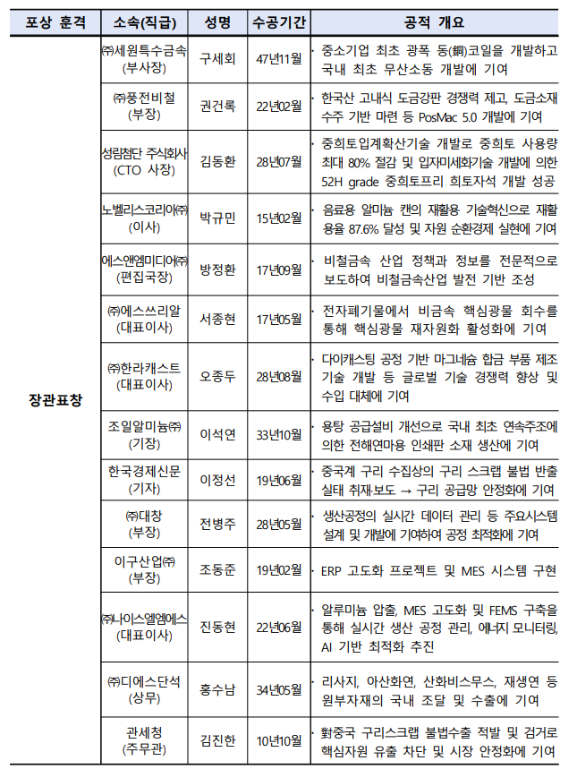 장관표창은 ▲세원특수금속 구세회 부사장 ▲디에스단석 홍수남 상무 ▲조일알미늄 이석연 기장 ▲대창 전병주 부장 ▲풍전비철 권건록 부장 ▲노벨리스코리아 박규민 이사 ▲에스쓰리알 서종현 대표 ▲나이스엘엠에스 진동현 대표 ▲한국경제신문 이정선 기자 ▲이구산업 조동준 부장이 받았다.