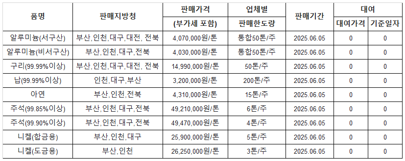 [표] 조달청 방출 가격(6월 5일)