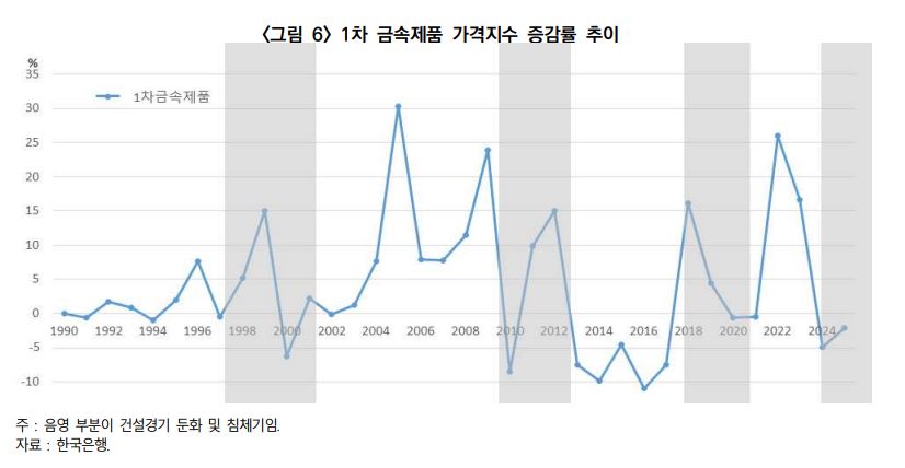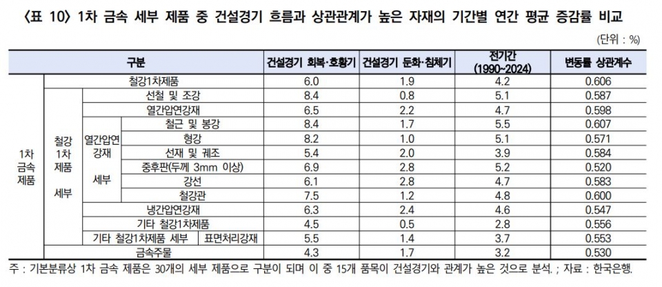 이 중 1차 금속 제품에서는 철근·봉강과 선철·조강이 평균 8.4% 오르며 건설경기 회복·호황기에서 가장 높은 물가 상승률을 보였다. 이어 △형강(+8.2%) △강관(+7.5%) △중후판(+6.9%) △열연강판(+6.5%) 순으로 건설경기 흐름과 높은 상관관계를 나타냈다.