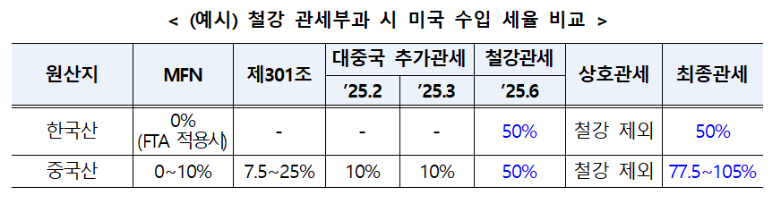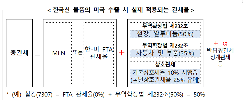 관세청에 따르면 현재 미국 행정부가 추진 중인 철강, 알루미늄 및 파생제품에 대한 제232조 관세는 해당 제품군 전체가 아닌, 미국이 지정한 부과 대상 품목에만 적용된다. 철강, 알루미늄 및 그 파생제품이라고 하더라도, 반드시 제232조 관세 부과 대상이 되는 것은 아니며, 미국이 발표한 대상 품목에 해당하는 경우에만 관세가 부과된다.