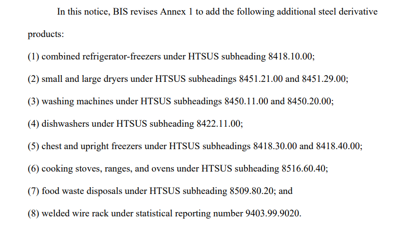미국 상무부가 냉장고와 건조기, 세탁기 등 일부 전자 제품을 철강 품목관세 적용 명단(부속서)에 포함시키겠다고 밝혔다. 앞서 미국 관세보호청(CBP)이 지난 6월 9일 파생제품 10개 품목 공지를 6월 9일 9시 40분경에 삭제하여 관세 부과를 하지 않는 것이 아니냐는 관측이 있었지만, 결과적으로 미국 행정부는 가전제품에 철강 수입 관세 부과를 결정했다.