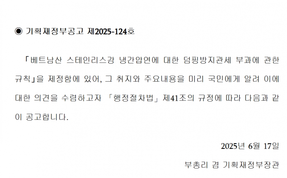 17일, 기획재정부는 공고를 통해 ‘베트남산 스테인리스강 냉간압연에 대한 덤핑방지관세 부과에 관한 규칙’을 제정하고 의견 수렴을 위해 관련 내용을 입법예고 한다고 밝혔다.