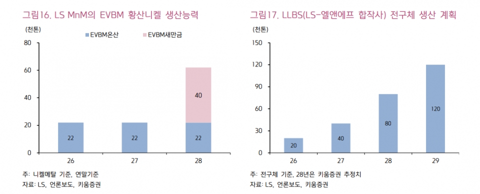 여기에 LS MnM이 지난해 10월부터 온산제련소 인근에 2.9만평 규모 이차전지 소재 복합 공장인 ‘EVBM온산’ 착공에 들어갔다. EVBM온산은 전구체의 핵심 소재인 황산니켈, 황산코발트, 황산망간 뿐만 아니라 양극재 소재인 수산화리튬까지 종합적으로 생산하는 공장을 목표로 하고 있다. 지주사 LS가 양극재 회사인 엘앤에프(L&F)와 합작해 'LS-엘앤에프 배터리솔루션(LLBS)'을 설립한 가운데 LLBS 공장까지 가동을 시작하면 조황산니켈(LS MnM) → 황산니켈(토리컴,EVBM온산/) → 전구체(LLBS) → 양극재(엘앤에프)로 이어지는 수직계열화가 완성되어 공정별로 시너지효과에 따른 경쟁력 확보가 가능할 것이란 분석이다.
