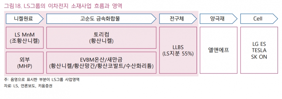 아울러 LS 그룹이 자회사 토리컴을 통해 2023년 생산능력 5,000톤 규모로 황산니켈 사업에 진출한 가운데 그룹은 2030년까지 3단계에 걸쳐 황산니켈 생산능력을 27만 톤(니켈메탈기준 6만 톤)으로 확대할 계획이다. LS MnM이 동제련 공정에서 생산한 조황산니켈(Ni 함량 18% 이상)을 공급하면, 토리컴이 불순물 정제와 결정화를 거쳐 이차전지용 황산니켈(Ni 22.3%)을 생산하는 구조가 만들어질 예정이다.
