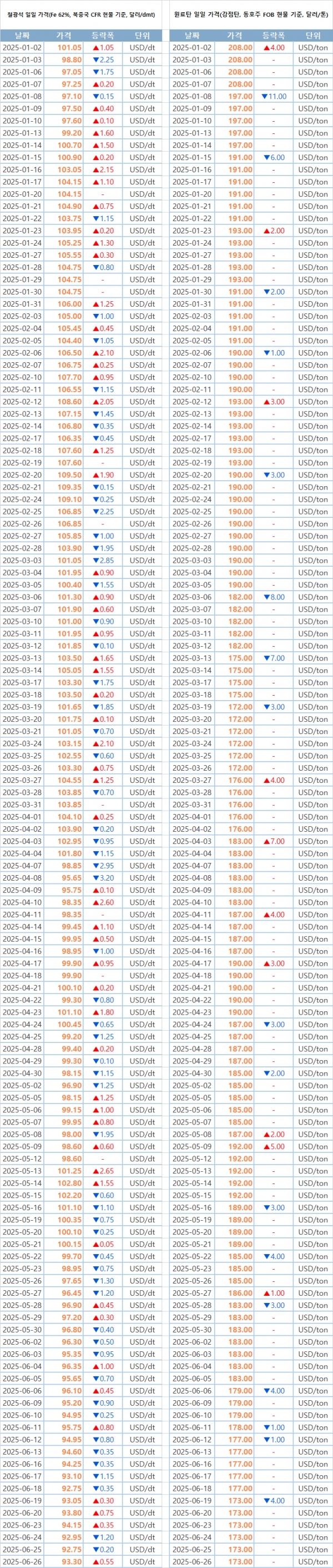 키워드 #철광석 #원료탄 이사무엘 기자 smlee@snmnews.com 다른 기사 보기 관련기사 출하에 방점 찍은 中 열연…저가 공세 여전 英, 7월부터 한국산 도금강판 무관세 수입 제한 “금형공구강 2차 유통업계, 수요 기반 갈수록 약화” KTR, 한국농공단지연합회와 업무협약 체결 포스코, 日 철스크랩 3주 연속 동결…저가 노크 꾸준 [주간시장동향-열연강판] 열연강판 유통價, 정체의 늪 [주간시장동향-후판] 수요는 잠잠, 가격은 눈치…후판 시장의 정적 [이슈] “관세 피할 생각 마라”…현대제철, 열연 반덤핑 설명회서 ‘소급 경고’ 직격탄 현대제철, 수요산업 중심 조직개편 단행…김원배 부사장, 신설 ‘영업본부’ 수장 ‘공기질도 상생으로’…포스코, 중소기업 손잡고 환경 챙긴다 “강철보다 강한 안전관리 필요”…고용부, 6대 철강사와 간담회 포스코 포항제철소, 지역 기업 QSS혁신리더 심화 교육…‘중소기업 경쟁력 향상’ 앞장 저작권자 © 철강금속신문 무단전재 및 재배포 금지