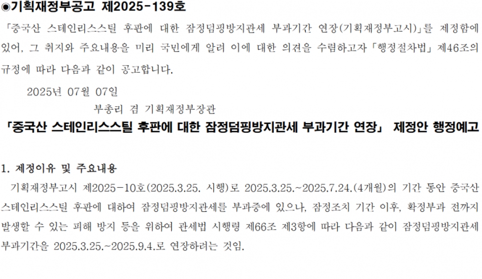 7일, 기획재정부는 공고를 통해 중국산 STS 후판에 대한 잠정 반덤핑 관세를 오는 9월 4일까지 연장하겠다고 알렸다. 당초 잠정 관세는 3월 25일에서 이달 24일까지 4개월 동안 적용될 예정이었다.