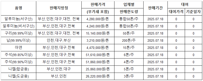 [표] 조달청 방출 가격(7월 18일)