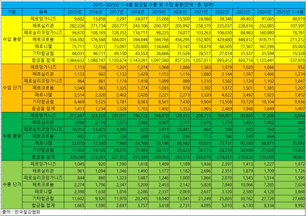 수요 감소에도 상반기 합금철 수입 전년比 6.1% 증가, 수출은 8.2% 감소