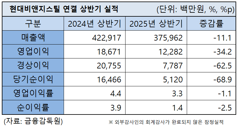 스테인리스 냉연강판(STS CR) 전문 단압밀인 현대비앤지스틸이 올해 상반기 철강 시황 악화에도 흑자 경영 성과를 달성했다. 다만 지난해 상반기에 비해 매출과 수익성이 모두 감소했다.