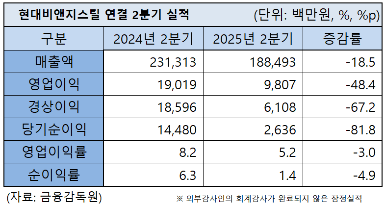 2분기 실적도 흑자 경영을 이어갔지만 전년 동기보단 일부 부진했다. 현대비앤지스틸의 2분기 잠정 연결 실적은 매출 1,884.9억 원, 영업이익 98억 원, 순이익 26.3억 원으로 각각 전년 도기 대비 18.5%, 48.4%, 81.8% 감소했다.