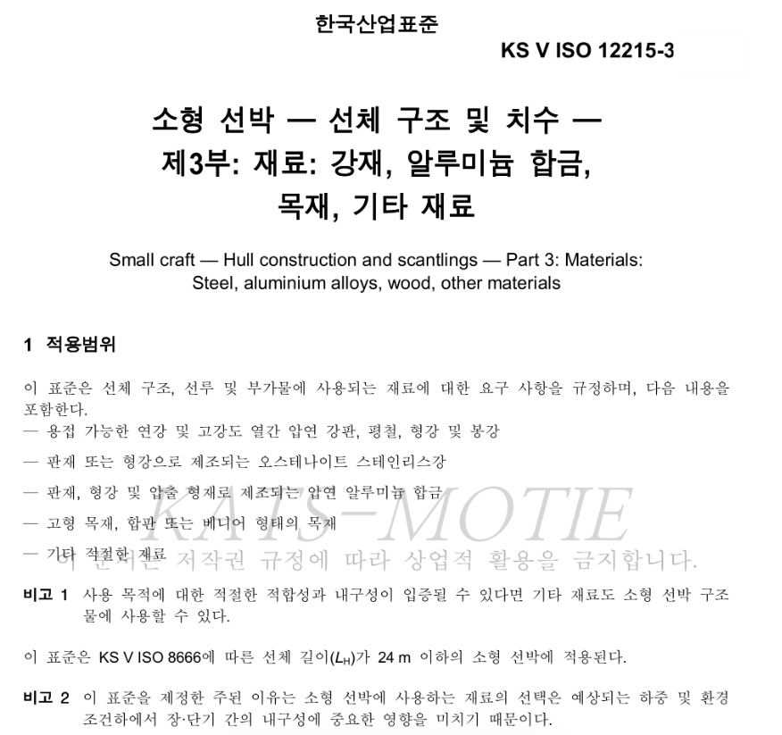 해당 한국산업표준(KS)은 소형선박 소재로 사용되는 오스테나이트강 스테인리스로 제작된 판재 또는 형강과 판재·형강류·압출 형태로 제조된 압연 알루미늄 합금, 용접 가능한 연강, 고강도 열간압연강판·봉강·형강, 목재류, 기타 선박 소재 등에 적용된다.