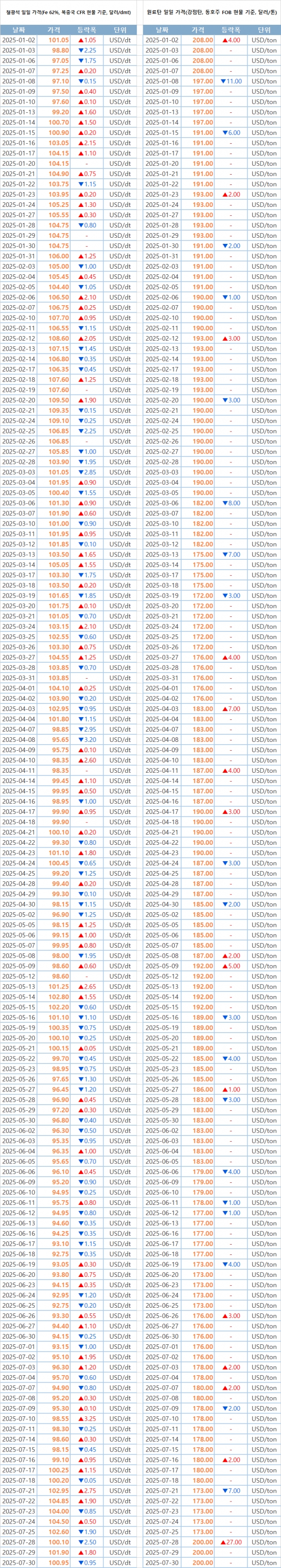 [표] 일일 철강 원료 가격 동향(7월 30일)