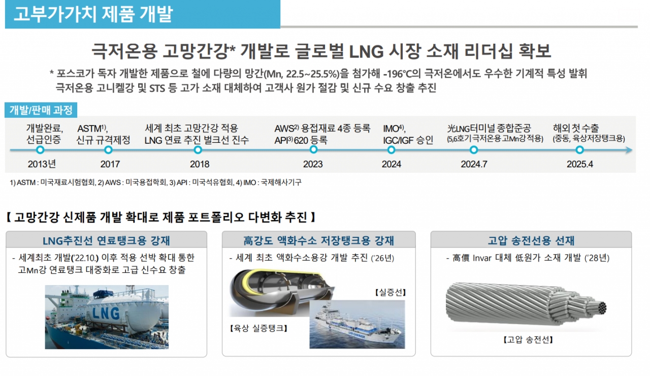 포스코홀딩스는 포스코가 고망간강 신제품 개발 확대로 제품 포트폴리오 다변화 추진하고 있다며 LNG추진선 연료탱크용 강재·고강도 액화수소 저장탱크용 강재·고압 송전선용 선재 등 점차 다양해지는 관련 제품 개발 및 생산&공급으로 글로벌 LNG 소재 시장에서 리더십을 확보하고 있다고 설명했다.