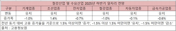 업종별 일자리 전망을 살펴보면 철강산업은 수출 여건 악화에도 내수가 소폭 반등하여 철강업종 고용은 전년 동기 수준으로 유지할 것으로 전망된다. 정부의 경기부양책에 따른 건설경기 회복 기대로 2025년 하반기 내수는 전년 동기보다 소폭 반등할 것으로 예상된다. 중국산 철강의 아세안 유입 확대, 미국 관세 등에 따른 수출 여건 악화로 2025년 하반기 수출은 전년 동기보다 감소할 것으로 예상되고, 내수 부진 및 수출 여건 악화로 생산량은 감소하나 내수 회복 기대로 철강 업종 고용은 전년 동기 수준을 유지할 것으로 전망된다.