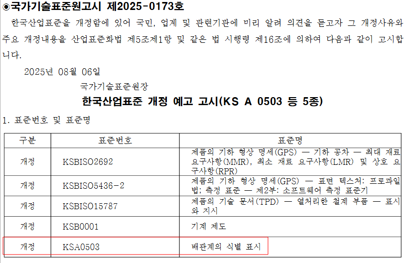 국표원은 “국제표준인 ISO 2692:2014가 ISO 2692:2021로 개정됨에 따라 부합화하기 위해 기관 자체 검토에 의해 개정을 진행하려 한다”고 설명했다.