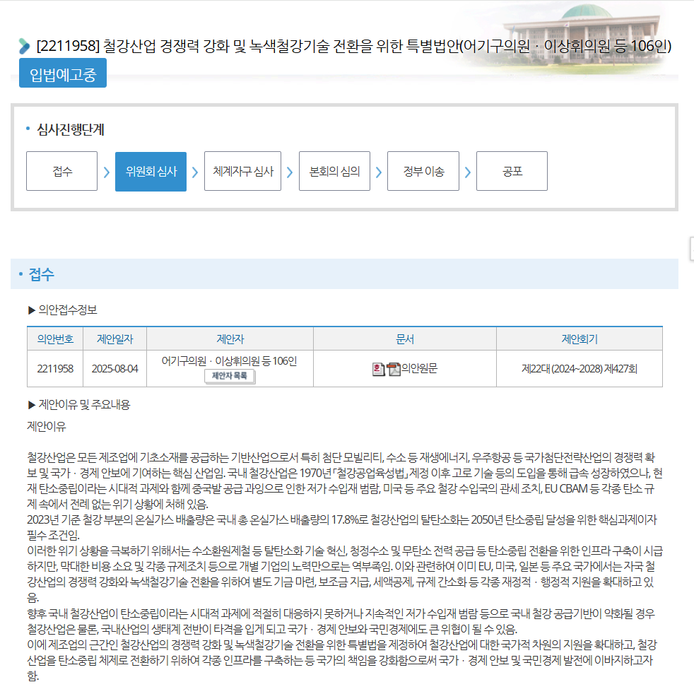 여당에 이어 제1야당인 국민의힘도 ‘K-스틸법(철강산업 경쟁력 강화 및 녹색철강기술 전환을 위한 특별법안)’을 당론으로 채택할 예정이다. 이에 빠르면 8월 국회 내 본회의 통과도 기대할 수 있게 됐다.