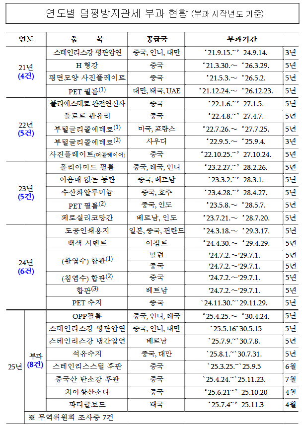 정부 관계자는 “정부는 전 세계적인 공급과잉에 따른 저가 제품의 우회 수출을 차단하고자 최근 관세법 시행령 개정(우회덤핑방지 관세부과 대상을 ‘제조국 내 경미한 변경’ → ‘제3국 포함’)을 추진하는 등 대응해 오고 있다”라며 “앞으로도 불공정 무역 대응에 필요한 조치를 적극 추진할 계획이다”고 밝혔다.