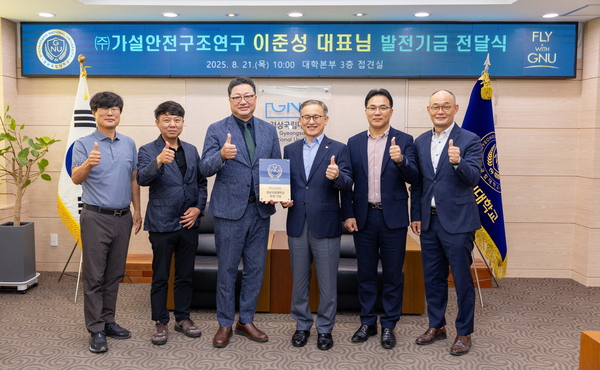 이준성 가설안전구조연구 대표가 경상국립대학교에 대학발전기금 1,000만원을 기탁했다. 가설안전구조연구의 발전기금 전달식은 21일 오전 10시 대학본부 3층 접견실에서 열렸다. 이 자리에는 경상국립대학교 권진회 총장, 오재신 국제처장, 김경수 국제협력부처장과 가설안전구조연구 이준성 대표, 흥한주택종합건설 강병환 본부장 등 10여 명이 참석했다. 행사는 참석자 소개, 기부증서 전달, 후원기업 명패 전달, 기념품 전달, 기부자 인사 말씀, 총장 감사 말씀, 기념 촬영의 순으로 진행됐다.