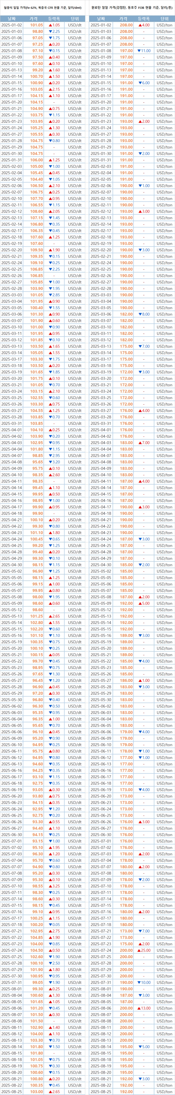 [표] 일일 철강 원료 가격 동향(8월 25일)