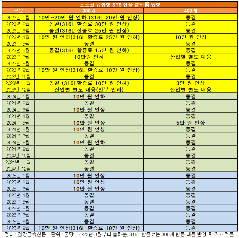 다만 원료 가격 및 원·달러 환율이 지속 높은 수준을 이어가고 있는 상황이 계속되면서 안정적 공급 및 가격 정상화를 위해 300계 가격을 인상한 것으로 파악된다.