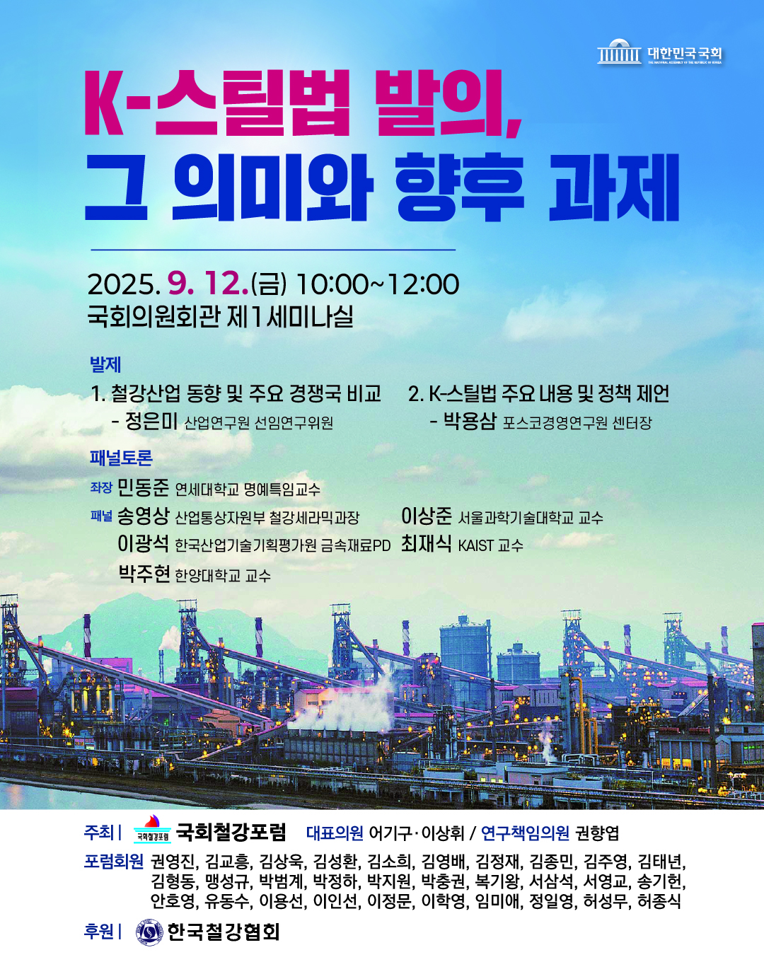 국회철강포럼은 오는 12일 오전 10시, 국회의원회권 제1세미나실에서 ‘K-스틸법 발의, 그 의미와 향후 과제’를 주제로 세미나를 개최할 계획이다.