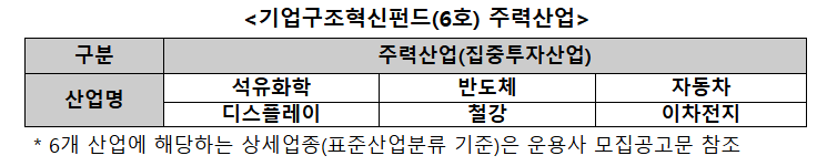 이에 철강과 자동차, 이차전지, 석유화학, 반도체, 디스플레이 등 6개 주력산업에 대한 지원 확대를 위해 정책금융기관들의 추가 출자로 펀드의 조성 규모를 총 1조 원으로 확대할 방침이다. 기업구조혁신펀드는 자본시장 중심의 구조조정 활성화를 위해 정책자금을 마중물로 민간자금을 유치하고, 이 재원으로 구조조정 기업에 투자하는 정책펀드이다.
