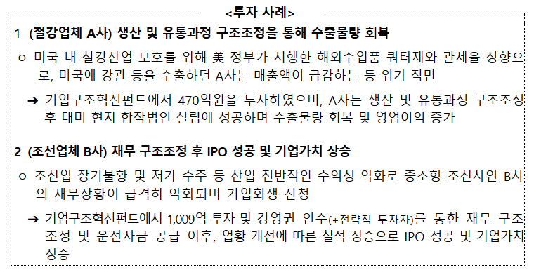주요 투자 사례로 A철강사는 펀드 투자를 통해 생산 및 유통과정 구조조정을 통해 수출 물량 회복에 성공하기도 했다. 미국에 강관 등을 수출하던 A철강사는 자국 철강산업 보호를 위해 미 정부가 시행한 해외수입품 쿼터제와 관세율 상향으로, 매출액이 급감하는 등 위기에 직면해 있었다.