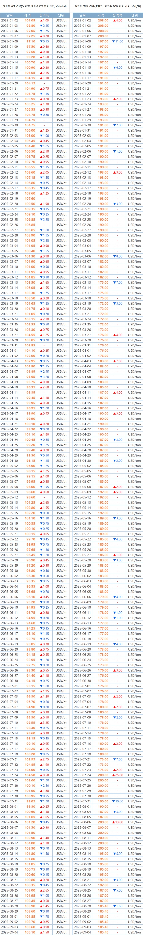 [표] 일일 철강 원료 가격 동향(9월 4일)