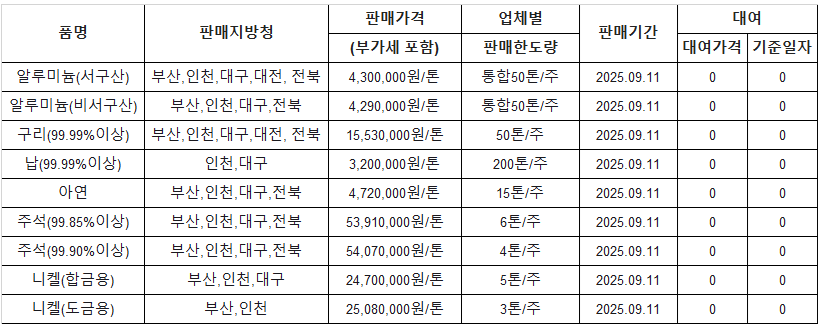 [표] 조달청 방출 가격(9월 11일)