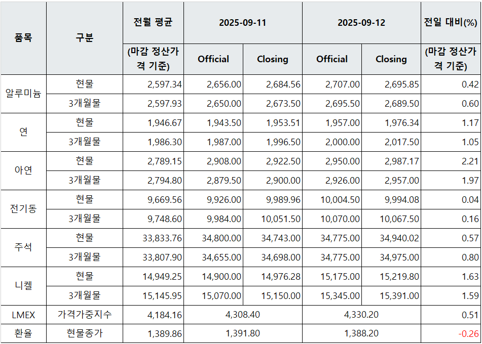 [표] LME 비철금속 및 환율 동향(9월 12일)