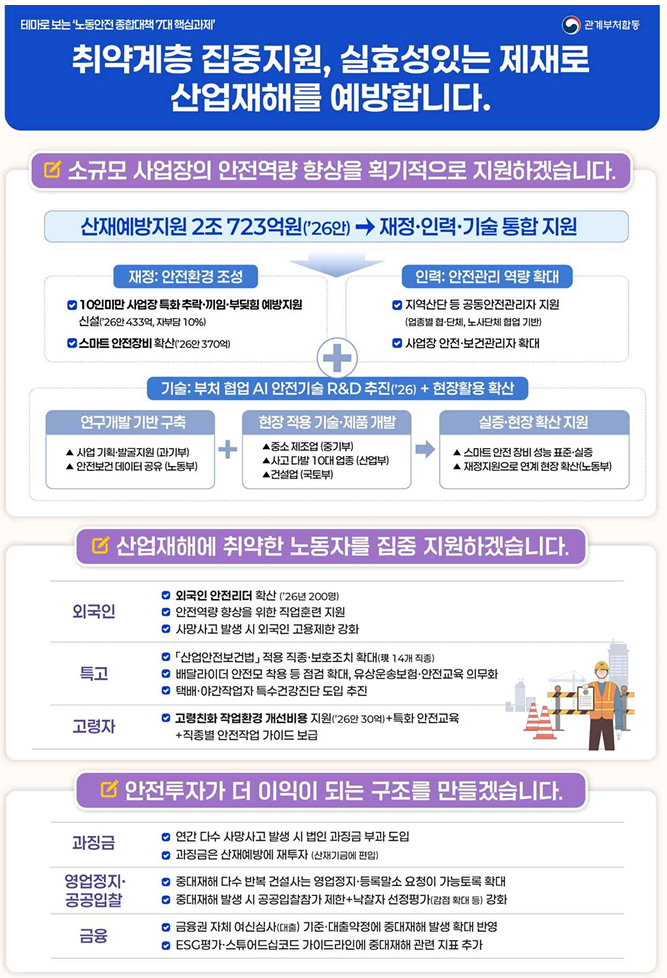 특히 10인 미만 사업장(50억 미만 건설현장 포함)의 추락·끼임·부딪힘 사고 예방을 위한 설비·품목 지원을 대폭 확대(26년 433억 원 신설 투입)한다. 또한 스마트 안전장비 지원도 확대(26년 370억 원)하며 부처 간 협업 등을 통해 인공지능(AI) 기술 등을 산업안전 분야에 확산·도입할 계획이다.