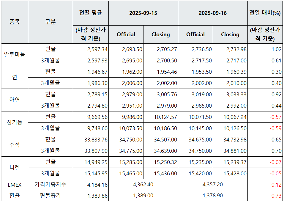 [표] LME 비철금속 및 환율 동향(9월 16일)