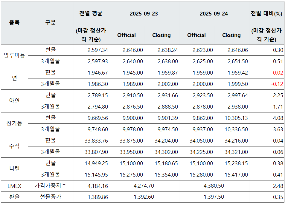 [표] LME 비철금속 및 환율 동향(9월 24일)